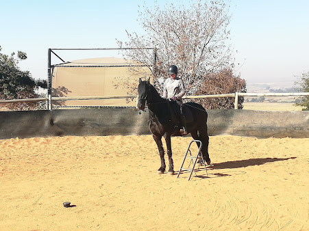 I was pleasantly surprised, though, with how good Lancey has been. He does have a lot of show miles that he acquired with his previous owner, but he really hasn't been to many places with me, and the Friesian farm can be pretty spooky. Baboons on the hill, turkeys and chickens all over the place, construction noises everywhere, a busy road nearby - he's not used to any of that. But he was totally fine. At one point he was hanging out with a bunch of the turkeys in his paddock.